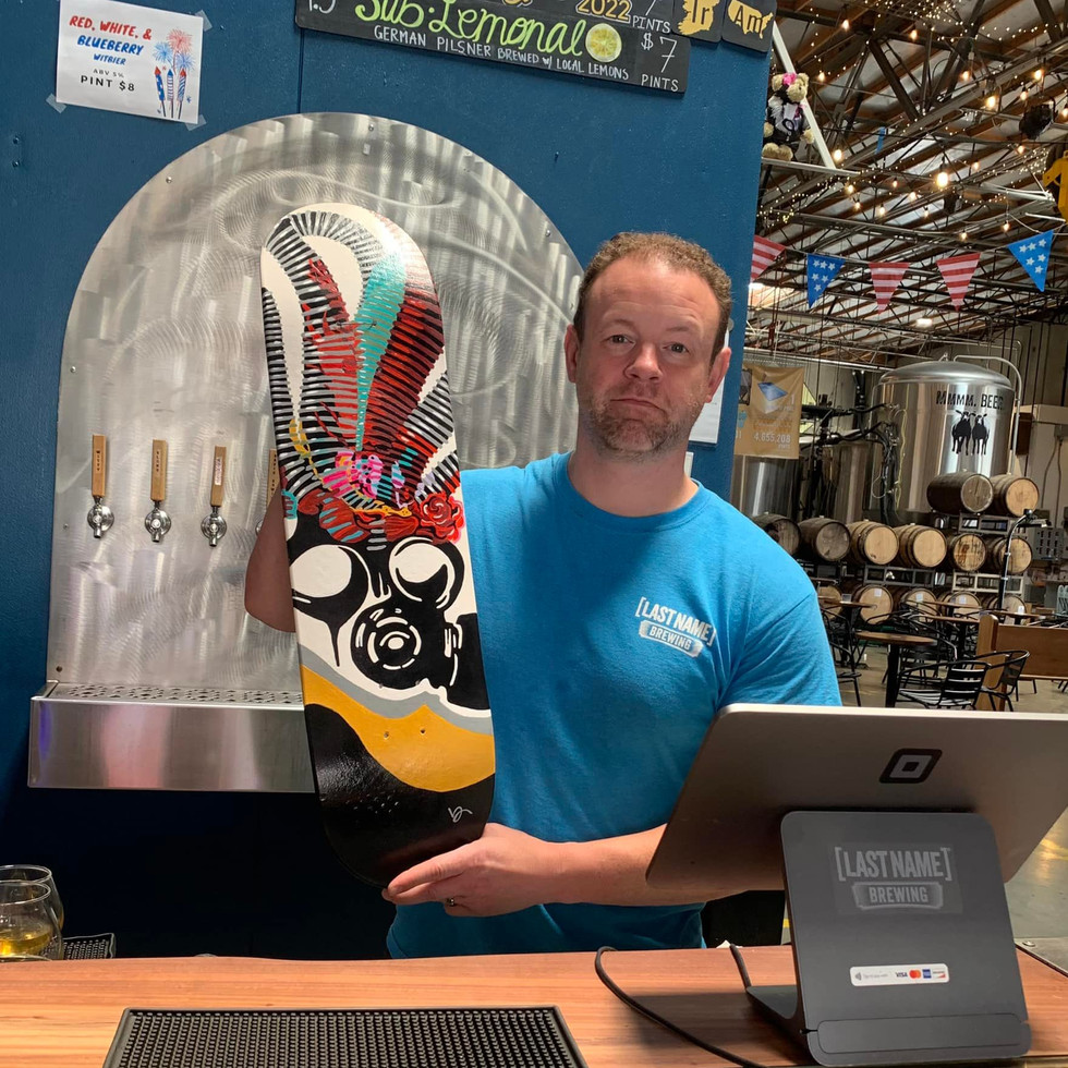 IN OTHER SKETCHIE NEWS...I dropped off my painted skateboard at Last Name Brewing in Upland CA for the 2-month group exhibition Skoolz Out which will feature over 20 artists and their skateboard deck art. Decks are for sale and proceeds will help purchase school supplies for underprivileged youth. Opening reception will be held on Friday, July 15th. Locals! Come join the fun. Even if you can't make the reception, my deck art will be hanging around Last Name for two months. Come and behold it. Or better yet, purchase it. It's for a good cause.